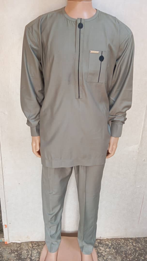 Add timeless elegance to your wardrobe with this olive green senator wear, tailored for men who appreciate clean lines and modern sophistication. This two-piece outfit features a long-sleeve top and matching trousers, both crafted from a smooth, breathable fabric for all-day comfort. Subtle black accents on the chest pocket and button line provide a stylish contrast, enhanced by a minimalist round-button detail and a sleek metallic tag for a refined finish. Ideal for traditional ceremonies, official functions, or weekend outings.